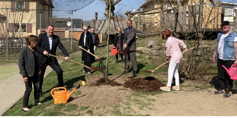 Mit dabei waren die Evonik Stiftung, die Bürgerstiftung Rheinfelden, das Netzwerk Ehrenamt, der Bewohnerbeirat Oberrheinfelden sowie die Stadt Rheinfelden. Ein begeisterndes Projekt von Bürgern für Bürger, das einen wichtigen Beitrag zum Klimaschutz und zu einem funktionierenden Stadtgrün in Rheinfelden leistet, nannte Oberbürgermeister Klaus Eberhardt die Aktion in seiner Begrüßungsrede. Kleine Kinder spielen nebenbei im Sandkasten, einige turnen auf den sanften Hügeln herum. Der Spielplatz in der Schwedenstraße ist gut besucht. Die Idee zur Baumpflanzaktion kam direkt hier aus dem Quartier Oberrheinfelden von Bewohnerbeirat Hans-Werner Birkel. Umgesetzt werden konnte sie dank der finanziellen Unterstützung durch die Evonik Stiftung und die Bürgerstiftung Rheinfelden. Die erste Baumpflanzung hier auf dem Spielplatz sei als Zeichen für ein engagiertes Quartiersmanagement zu verstehen, so der Oberbürgermeister, der sich in seiner Rede bei den vielen Beteiligten und bei den Unterstützern herzlich bedankte.