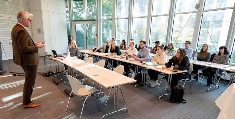 Viele spannende Vorträge standen auf dem Programm; Jakob Reichstein, The Supraparticle Group, Professorship for Inorganic Chemistry, Department of Chemistry and Pharmacy at Friedrich-Alexander University Erlangen-Nürnberg gab Einblicke in sein Forschungsthema „The Supraparticle Group and its connection to the Evonik and the German Environmental Foundation (DBU). Jakob Reichstein arbeitet in der Gruppe von Professor Karl Mandel, der 2010 ebenfalls Stipendiat der Evonik Stiftung war. Sarah Hintermayer, Head of Regional Strategy at Evonik Industries AG erzählte von ihrem Weg von der Bioverfahrenstechnikerin zum Intrapreneur bei Evonik, Stefan Haver, Head of Corporate Sustainability at Evonik Industries AG berichtete über das Thema „Sustainability as a growth driver“ und gab einen Ausblick auf die nachhaltige Unternehmenstransformation von Evonik, Oliver Busch, Vice President Defossilation at Evonik erklärte, warum grüner Wasserstoff in Zukunft eine zentrale Rolle in unserer Gesellschaft spielen wird. Julia Hess, Projektmanagerin "Technologie und Geopolitik der Stiftung Neue Verantwortung in Berlin schloss den Tag mit ihrem Vortrag „Creating Impact from a tech policy think tank perspective - the case of the EU Chips Act“ ab. Auch die beiden Mentoren Walter Pfefferle, Head of Incubation Cluster Solutions Beyond Chemistry at Evonik und Peter Nagler, ehem. Head of Innovation at Evonik Industries AG nahmen an dem Stipendiatentreffen teil.